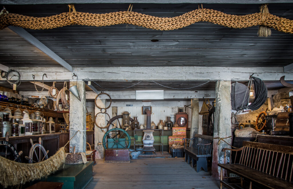 Located in the first floor of the Charles Mallory Sail Loft, our ship chandlery is used as a location to display a large number of objects from the Museum’s collection. All sorts of items that would have been available in a 19th-century chandlery are on view, from anchor balls and lights to bomb lance guns, hoops, and caulking irons.