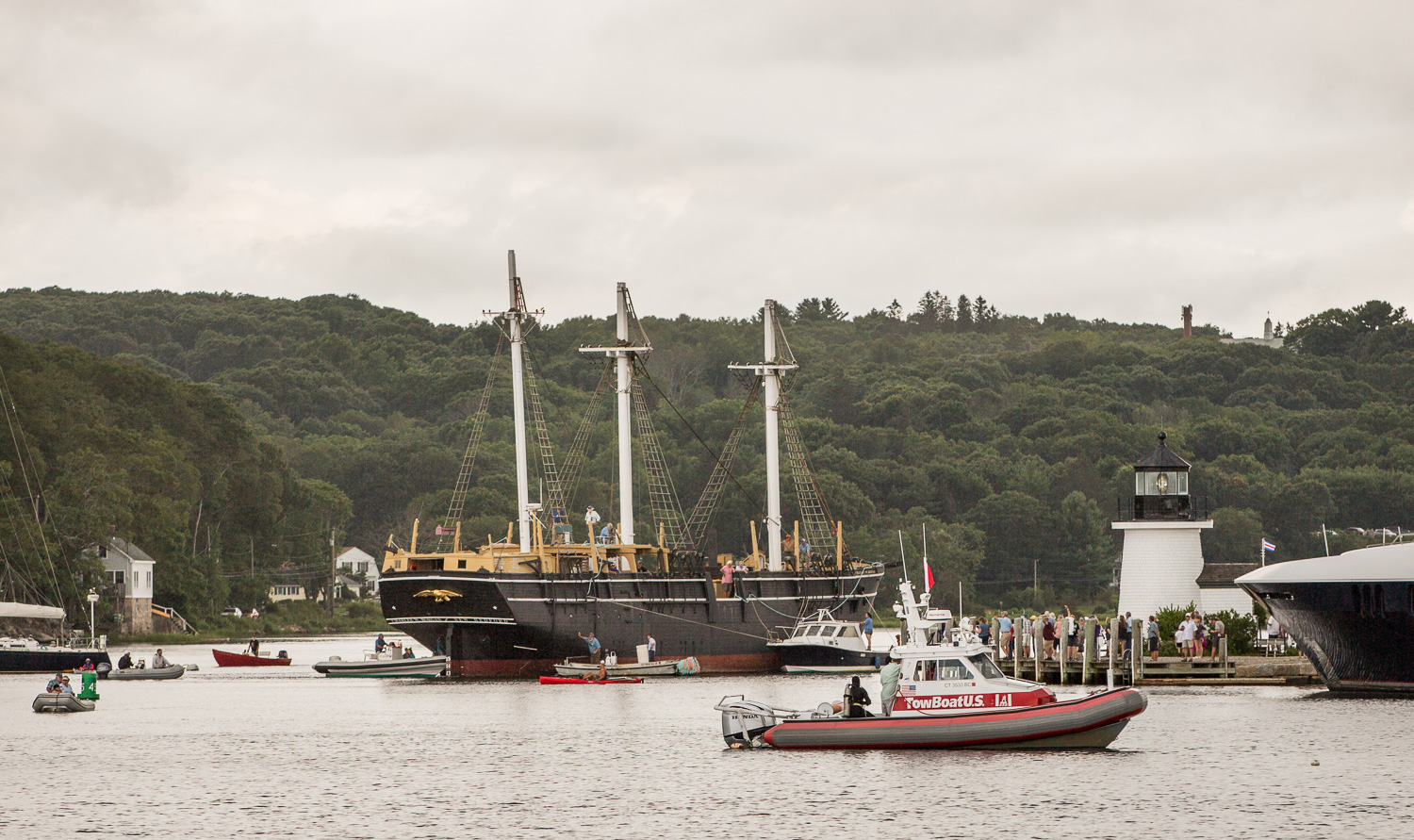 The ship was moved from its berth on the Museum’s waterfront to the shipyard at the south end of the property. The public was invited to watch as the ship is pushed and towed down the river beginning around 3:30 p.m.