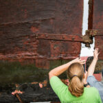 Once at the shipyard, staff hauled the Morgan out of the water on the yard’s synchronized shiplift and then moved it onto dry land so the Museum’s shipwrights could access the hull for work. Once pulled into the work area, the hull was power washed and inspected. Of note was a significant level of corrosion of the copper sheathing that protects the keel.