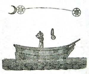 An engraving from “Megarey’s Nautical Almanac” from 1843 illustrating in a quaint way the process of a lunar. The navigator aboard his de-masted vessel is holding a sextant and using it to bring a star across the sky into contact with the Moon’s limb thus measuring the lunar distance. The lunar distance provides absolute time or GMT. The navigator compares that with local time, frequently kept on a watch, which we see “floating” next to him.